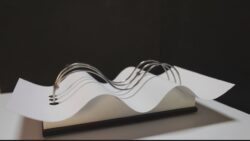 オーバー ザ ウェーヴス 1974年/2016年再制作 紙 マグネットリング 5.0 × 21.5 × 11 cm 波状を呈した板の上に、その凹凸に合わせるように加工された3本の軸が並列に配される。各軸には1つの素子が備えられ、それぞれが闊達な動きを見せ軸上を往来... 2023.06.15 佐藤慶次郎作品