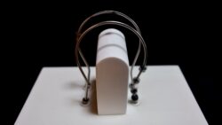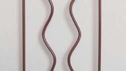 トゥイン 1974年 アルマイト線 マグネットリング 石膏 9.4 × 10.0 × 10.0 ㎝ 垂直に立った石膏台座の前面に、ループ状の軸が対となって向き合い、各軸に一つずつ素子が配される。 軸の形状は、直線状に伸びた軸を外側に、内側は5つの波... 2023.11.04 佐藤慶次郎作品