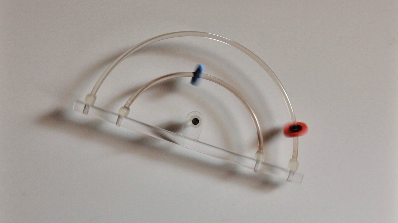 一本の軸上に大小二つのアーチが架かり、大アーチにピンク、小アーチに水色の素子が付く。軸の真中には舌状の軸受が取り付けられ、石膏の台座から突き出た回転軸と結合する。素子がつくる不規則な動きがもたらす左右バランスの均衡と不均衡のモーメントがアーチ全体を回転させ、シーソーを連想させるパフォーマンスを生む。